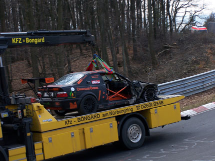 Eine Runde später: Brand des BMW, Schaden irreparabel. Kein Neuaufbau mehr möglich